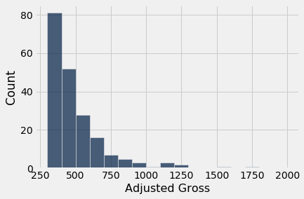bin_counts = millions.bin('Adjusted Gross', bins=np.arange(300,2001,100))