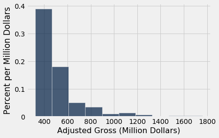 millions.hist('Adjusted Gross', bins=np.arange(300,2001,100), unit="Million Dollars")